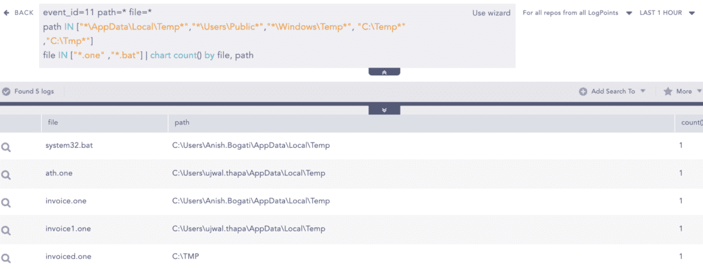 Furthermore, we saw some instances of files created by the OneNote file as well. Not particularly to OneNote, a file created on a suspicious location is always a good place to monitor for potential attacks. These should include non-default pathways. A defender should include them in the Sysmon configuration or use the following Logpoint detection query with the custom path in the “path“ field could be used. However, enabling logging with directory monitoring should be prioritized.