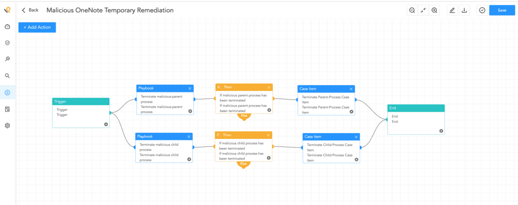 Once the attached OneNote is identified as malicious, analysts simply can run this playbook manually or run it automatically. On successful trigger of the playbook, it will delete/remove the OneNote attachment download by the user and terminate the malicious process, isolate the host, and change the host status to remediated from malicious.