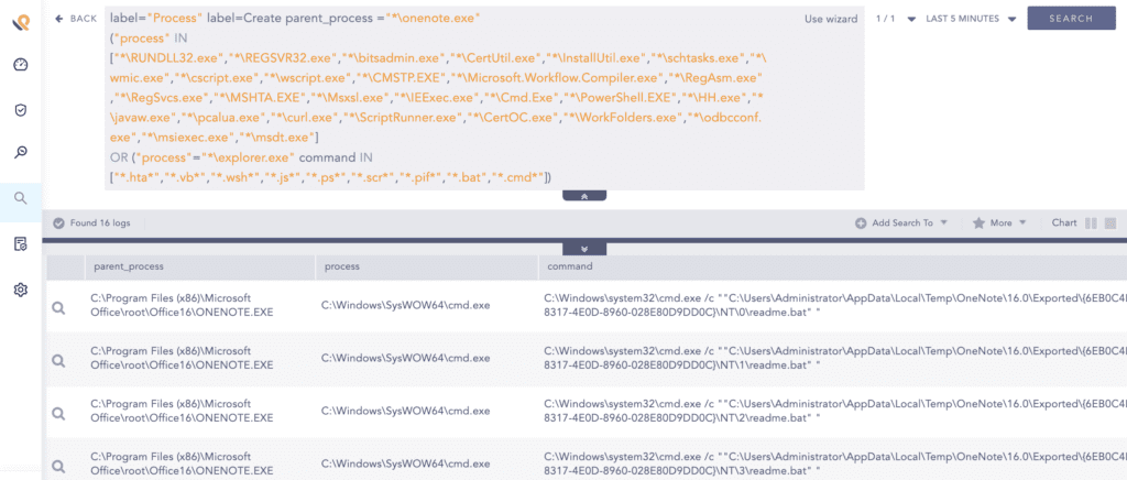 Using the above query, we see that OneNote is creating CMD shells that are running a malicious .bat file.