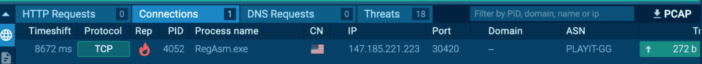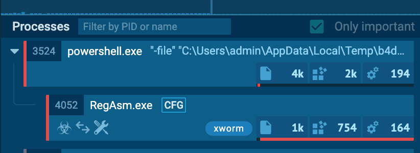 In one particular case, we detected a malicious PowerShell script leading to process injection using RegAsm.exe, a legitimate Windows utility used for .NET assembly registration, and observed RegAsm.exe executing without any command-line parameters (a common indicator of process injection) and performing a C2 connection.
