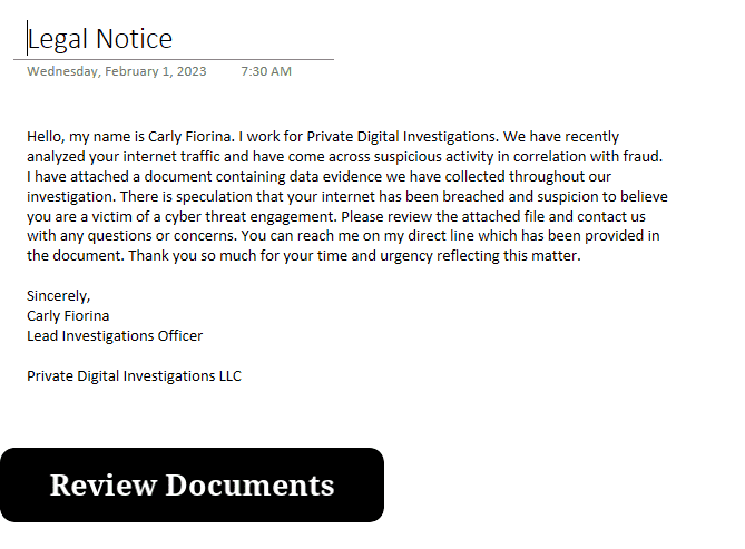 In Sample 2 (SHA256:68ED66B62E1E6ADF5A5E0BAAB0C1BBEF63DC5D52C514BA7D8FF5B6295A498CB6), an attacker uses Legal Notice ‘Review Documents’ overlay to hide the payload.