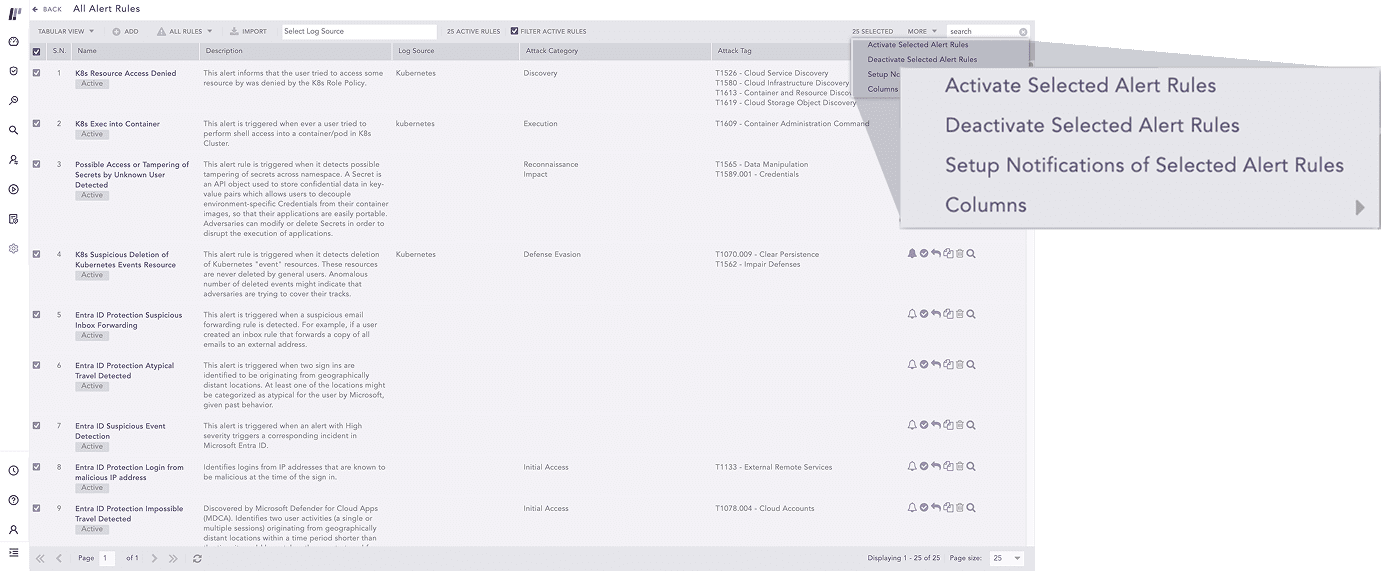 This poses a significant reduction in time spent on alert rule administration, freeing up SOC analysts to focus on higher-priority tasks like threat hunting and incident response. It only takes to select the alert rules from the list and apply the action of your choice, boosting overall security operations efficiency.