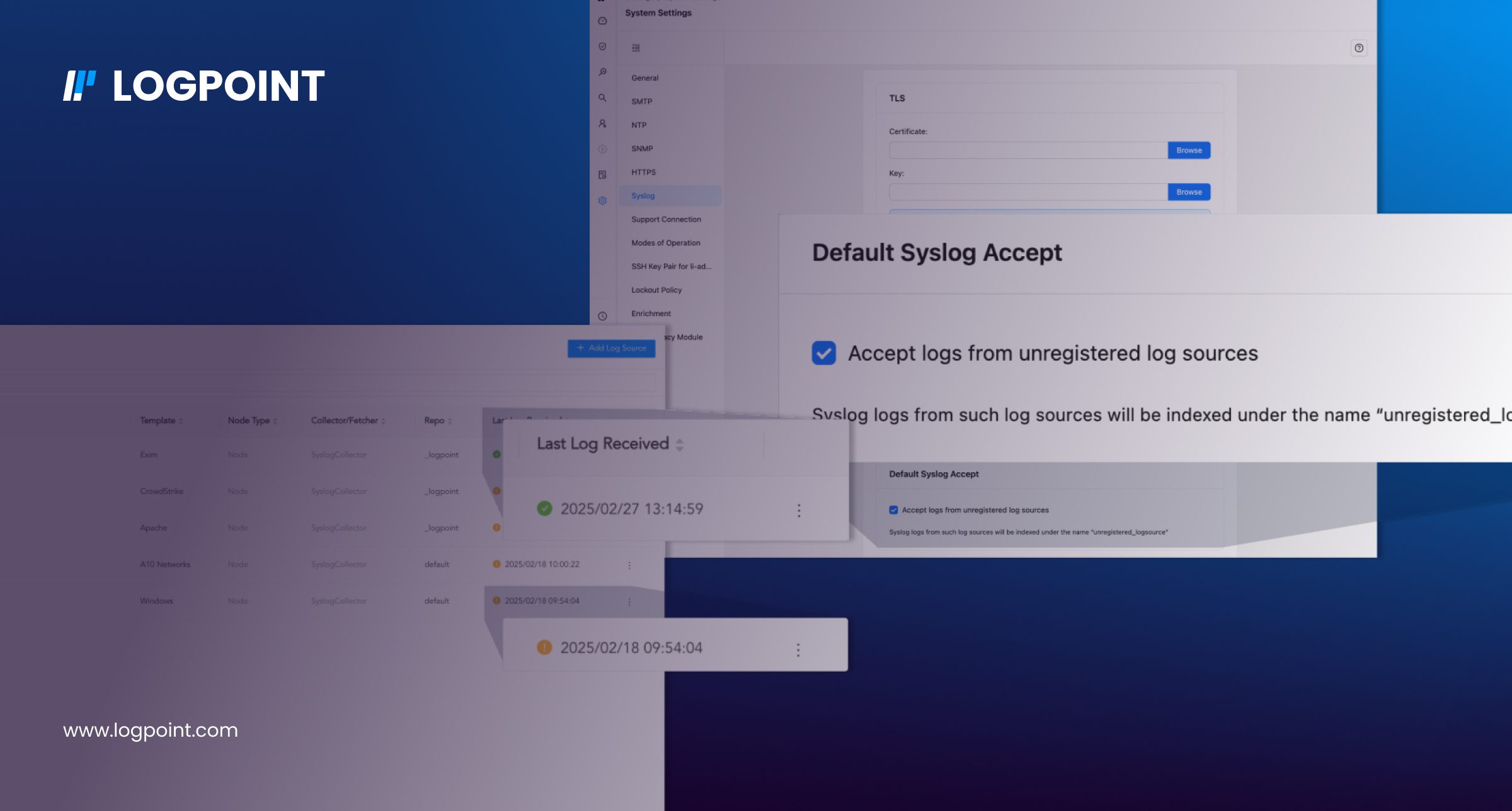 This is why Logpoint now automatically accepts Syslog messages right out of the box. This Default Log Accept feature means immediate log collection after installation, frictionless onboarding for new clients, and seamless scalability as you add new Logpoint instances – all without losing a single log. Gain instant security visibility and reduce onboarding costs, ensuring you're protected from day one.
