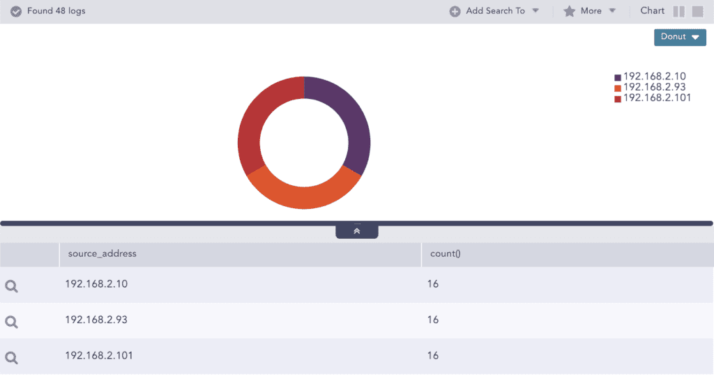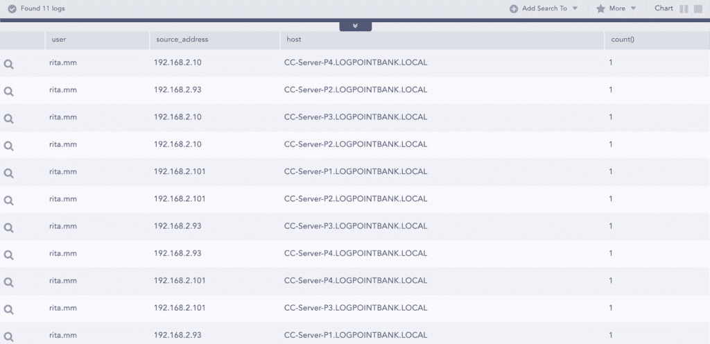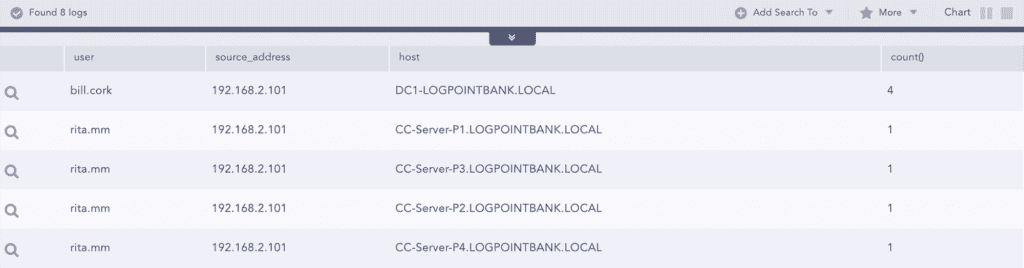 After this, they pick one the source IPs used by user Rita to check if there are other failed attempts or not. With another query, they can get the failed login attempts for specific sources: label=Login label=Fail source_address=192.168.2.101 | chart count() by source_address,workstation,user,host