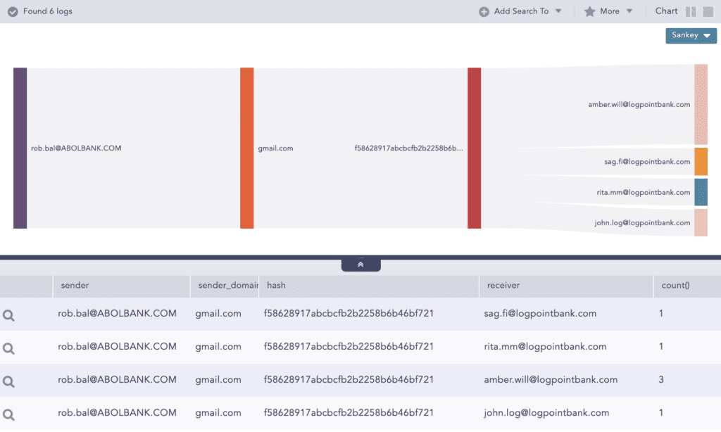 To start looking for file infections, the analyst can run a simple query: label=Detect label=File label=Infection | chart count() by sender,sender_domain,hash, receiver