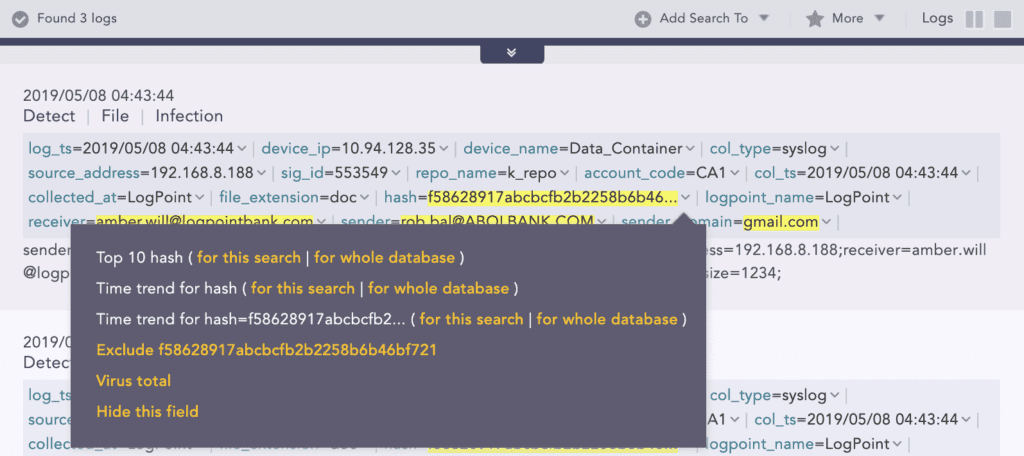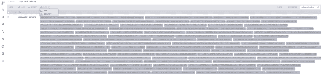 With access to this threat intelligence now saved in the platform, analysts can retrieve a series of known bad hashes. These lists of enriched data from a third-party provider can also be used to find logs that are considered risky by cross-referencing against them URLs, hashes, IPs, amongst others, during the query.