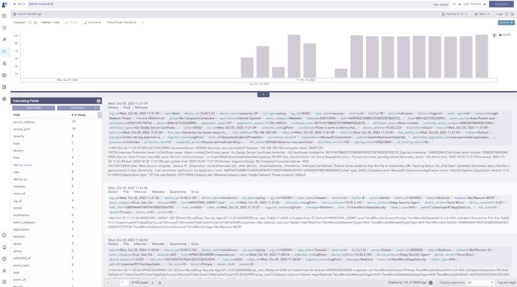The search console can become a powerful ally when looking for threats. Here the threat hunter will start with simple queries to show all matches for a specific data label. For example, the security analyst can start by typing label=malware.