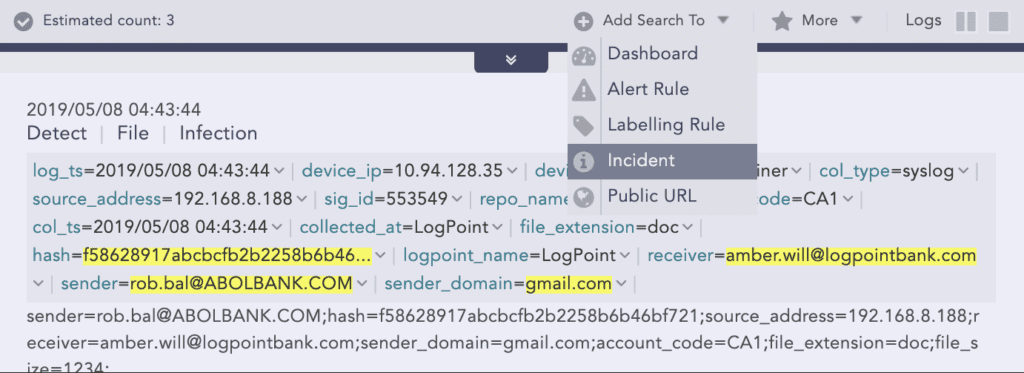 The analyst starts by creating an incident for follow-up directly from the search.