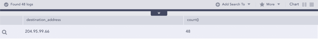 Here, the analyst drills down on the category for malware command and control to check other source addresses associated with it and runs the following query: category="Malware Command And Control" | chart count() by source_address