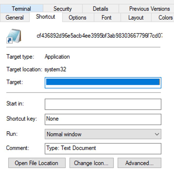 So, while typically viewing an LNK file’s properties, the payload appears in the Target field. However, these values are actually mapped to the components listed above.