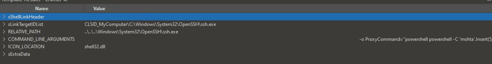 COMMAND_LINE_ARGUMENTS – Stores commands that automatically execute when the shortcut is opened. This is where the payload is embedded, and what makes it particularly interesting is that only the command-line portion is present, rather than the initial binary itself. (See the "LNK File Component Contents" image for better understanding.)